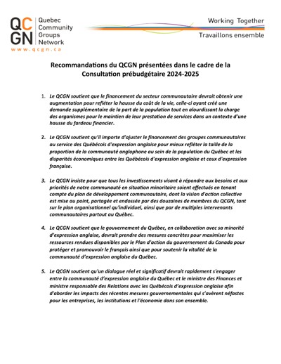 Quebec Community Groups Network (QCGN). “QCGN Recommendations to the 2024–2025 Pre-Budget Consultation,” January 19, 2024.