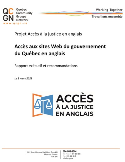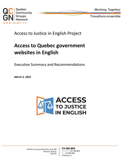 Quebec Community Groups Network (QCGN). Access to Justice in English Project : Access to Quebec Government Websites in English : Executive Summary and Recommendations. Montreal, QC, March 2, 2023.