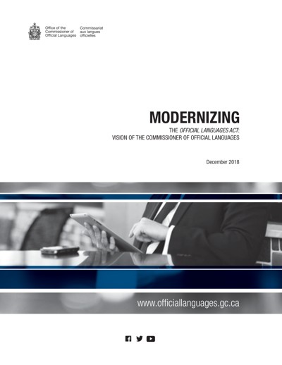 Canada. Office of the Commissioner of Official Languages. Modernizing the Official Languages Act : Vision of the Commissioner of Official Languages, December 2018.