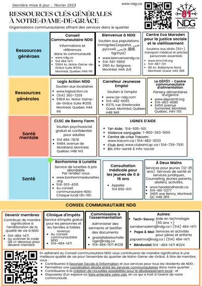 NDG Community Council (NDGCC). “Ressources clés générales à Notre-dame-de-Grâce / Key General Resources in Notre-Dame-de-Grâce,” February 2023.