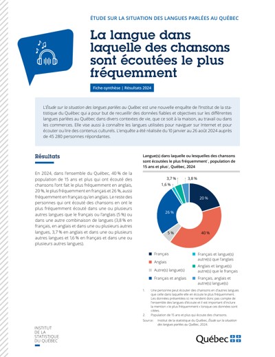 Québec. Institut de la statistique du Québec. La langue dans laquelle des chansons sont écoutées le plus fréquemment. Étude sur la situation des langues parlées au Québec, 2025.