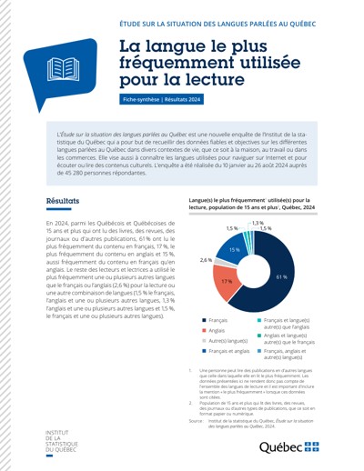 Québec. Institut de la statistique du Québec. La langue le plus fréquemment utilisée pour la lecture. Étude sur la situation des langues parlées au Québec, 2025.