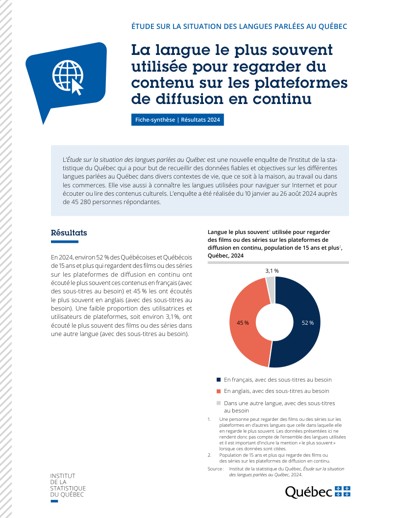 Québec. Institut de la statistique du Québec. La langue le plus souvent utilisée pour regarder du contenu sur les plateformes de diffusion en continu. Étude sur la situation des langues parlées au Québec, 2025.