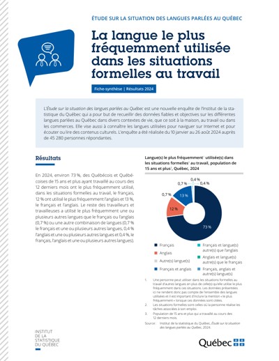 Québec. Institut de la statistique du Québec. La langue le plus fréquemment utilisée dans les situations formelles au travail. Étude sur la situation des langues parlées au Québec, 2025.