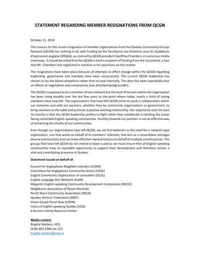 Council for Anglophone Magdalen Islanders (CAMI), Committee for Anglophone Social Action (CASA), English Community Organization of Lanaudière (ECOL), English Language Arts Network (ELAN), Megantic English-speaking Community Development Corporation (MCDC), Neighbours Regional Association of Rouyn-Noranda, North Shore Community Association (NSCA), et al. “Statement Regarding Member Resignations from QCGN,” October 31, 2019.