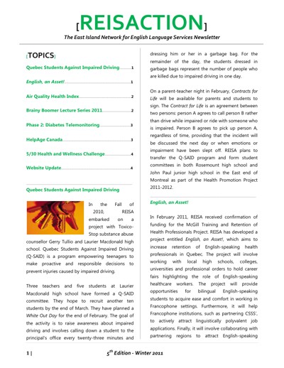 Réseau de l’est de l’île pour les services en anglais (REISA). “East-Island Network Newsletter : Reisaction,” no. 5 (Winter 2011).