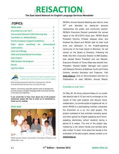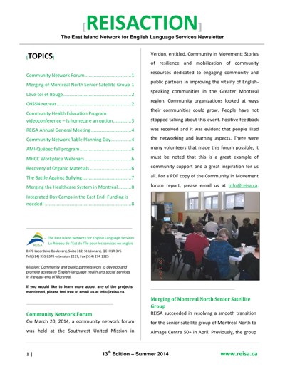 Réseau de l’est de l’île pour les services en anglais (REISA). “East-Island Network Newsletter : Reisaction,” no. 11 (Summer 2013).