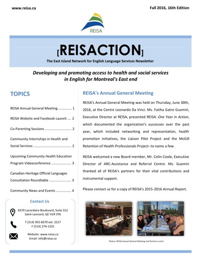 Réseau de l’est de l’île pour les services en anglais (REISA). “East-Island Network Newsletter : Reisaction,” no. 16 (Fall 2016).