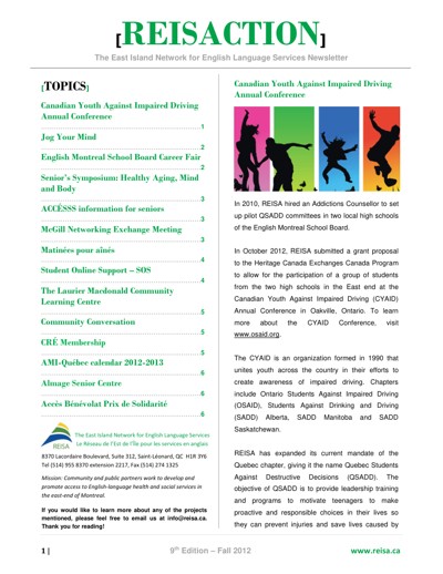 Réseau de l’est de l’île pour les services en anglais (REISA). “East-Island Network Newsletter : Reisaction,” no. 9 (Fall 2012).