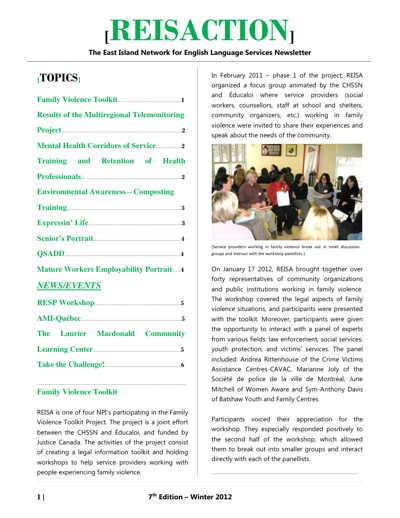 Réseau de l’est de l’île pour les services en anglais (REISA). “East-Island Network Newsletter : Reisaction,” no. 7 (Winter 2012).