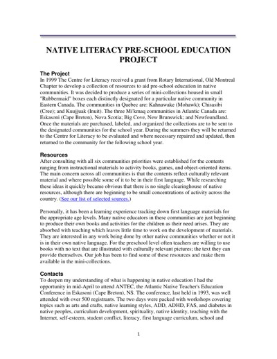 The Centre for Literacy of Quebec (CFL). Native Literacy Pre-School Education Project. The Centre for Literacy of Quebec (CFL), 1999.