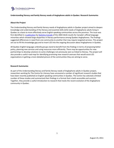 The Centre for Literacy of Quebec (CFL). Understanding Literacy and Family Literacy Needs of Anglophone Adults in Quebec : Research Summaries. Montreal, QC, August 23, 2011.