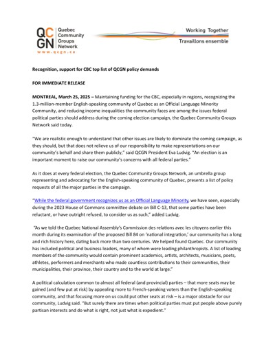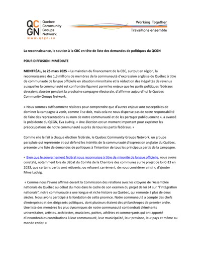 Quebec Community Groups Network (QCGN). “Recognition, Support for CBC Top List of QCGN Policy Demands,” March 25, 2025.
