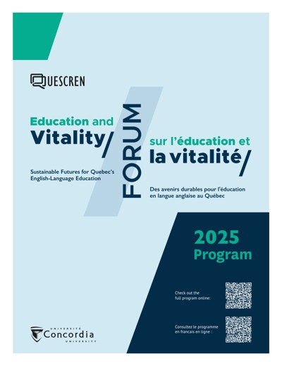 Quebec English-speaking Communities Research Network (QUESCREN). “Education and Vitality Forum : Sustainable Futures for Quebec’s English-Language Education / Forum sur la l’éducation et la vitalité : des avenirs durables pour l’éducation en language anglaise au Québec,” 2025.