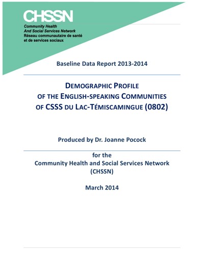 Pocock, Joanne. Baseline Data Report 2013-2014 : Demographic Profile of the English-Speaking Communities of CSSS Du Lac Temiscamingue (0802). Community Health and Social Services Network (CHSSN), March 2014.