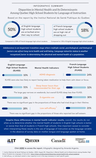 Quebec English-speaking Communities Research Network (QUESCREN). “Disparités en santé mentale et ses déterminants chez les jeunes du secondaire au Québec selon la langue d’enseignement,” 2023.