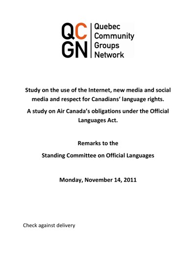 Quebec Community Groups Network (QCGN). “[Study on the Use of the Internet, New Media and Social Media and Respect for Canadians’ Language Rights : A Study on Air Canada’s Obligations under the Official Languages Act : Remarks to the Standing Committee on Official Languages],” November 14, 2011.