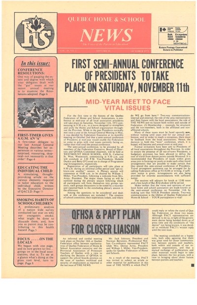 Quebec Federation of Home and School Associations (QFHSA). “Quebec Home & School News” 10, no. 2 (October 1972).
