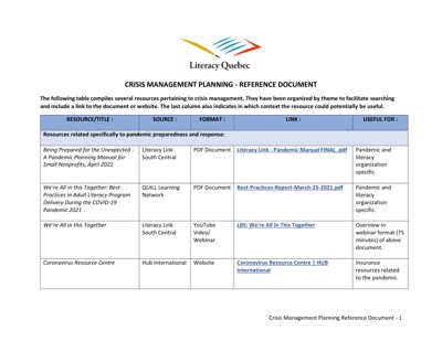 Literacy Quebec (LQ). “Crisis Management Planning - Reference Document,” 2021.