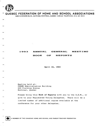 Quebec Federation of Home and School Associations (QFHSA). 1993 Annual General Meeting : Book of Reports. Montreal, Quebec, April 24, 1993.