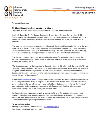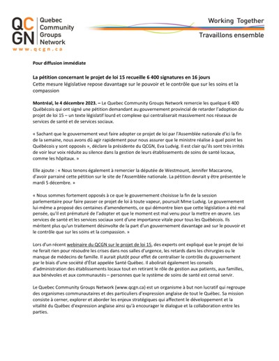 Quebec Community Groups Network (QCGN). “La pétition concernant le projet de loi 15 recueille 6400 signatures en 16 jours,” December 4, 2023.