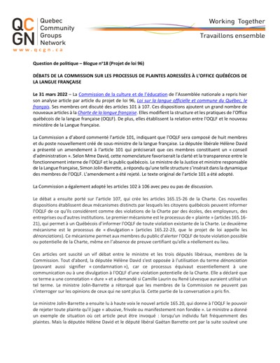 Quebec Community Groups Network (QCGN). “Committee Debates New Complaints Procedures for the Office Québécois de La Langue Française,” March 31, 2022.