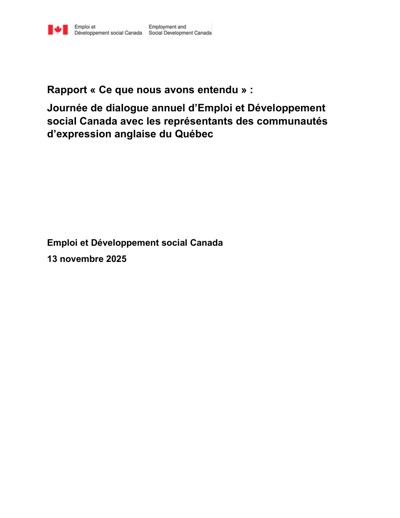 Canada. Employment and Social Development Canada. Rapport «Ce que nous avons entendu» : journée de dialogue annuel d’Emploi et Développement social Canada avec les représentants des communautés d’expression anglaise du Québec, November 13, 2025.
