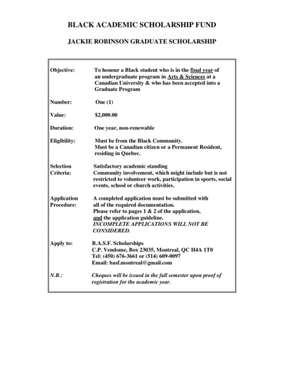 Black Academic Scholarship Fund (BASF). “Black Academic Scholarship Fund : Jackie Robinson Graduate Scholarships,” n.d.