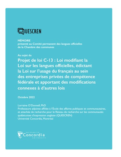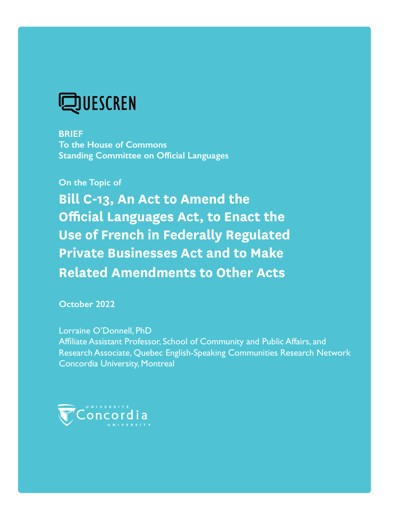 O’Donnell, Lorraine. Brief to the House of Commons Standing Committee on Official Languages on the Topic of Bill C-13, an Act To Amend the Official Languages Act, to Enact the Use of French in Federally Regulated Private Businesses and to Make Related Amendments to Other Acts. Quebec English-speaking Communities Research Network (QUESCREN), October 2022.
