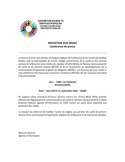 Centre for Access to Services in English (CASE). “Invitation aux media : Conférence de presse,” September 2016.