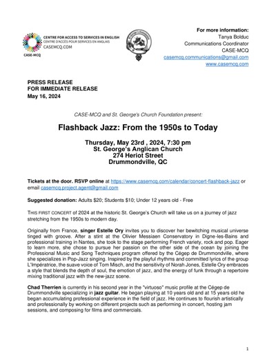 Centre for Access to Services in English (CASE). “CASE-MCQ and St. George’s Church Foundation Present : Flashback Jazz : From the 1950s to Today,” May 16, 2024.
