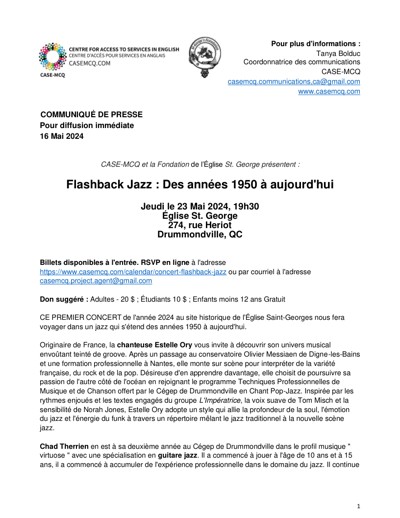 Centre for Access to Services in English (CASE). “CASE-MCQ et la Fondation de l’Église St. George présentent : Flashback Jazz : Des années 1950 à aujourd’hui,” May 16, 2024.