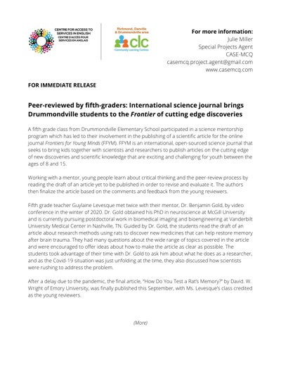 Centre for Access to Services in English (CASE). “Peer-reviewed by Fifth-graders : International Science Journal Brings Drummondville Students to the Frontier of Cutting Edge Discoveries,” November 2021.