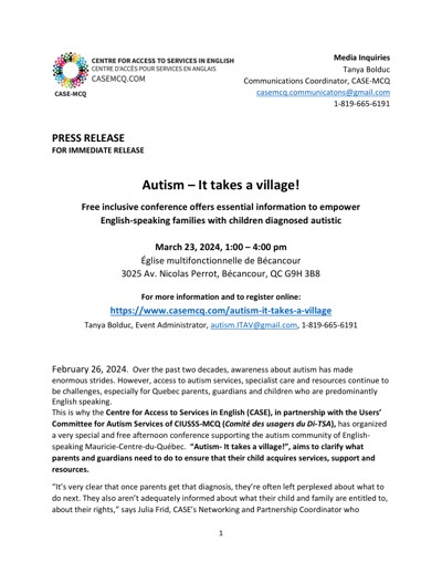 Centre for Access to Services in English (CASE). “Autism – It Takes a Village!,” February 26, 2024.