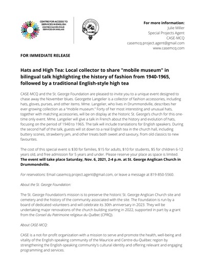 Centre for Access to Services in English (CASE). “Hats and High Tea : Local Collector to Share ‘Mobile Museum’ in Bilingual Talk Highlighting the History of Fashion from 1940-1965, Followed by a Traditional English-style High Tea,” November 2021.