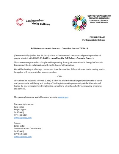 Centre for Access to Services in English (CASE). “Fall Colours Acoustic Concert - Cancelled Due to COVID-19,” September 30, 2020.