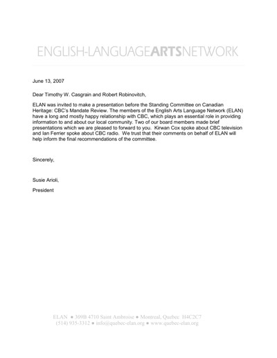English Language Arts Network (ELAN). “ELAN Speech to Parliamentary Committee on CBC Review,” May 24, 2007.