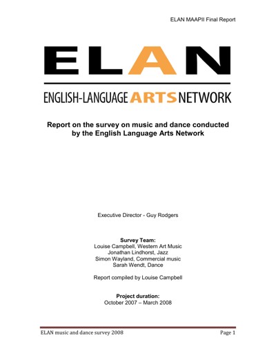 English Language Arts Network (ELAN). Report on the Survey on Music and Dance Conducted by the English Language Arts Network, March 2007.