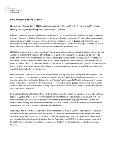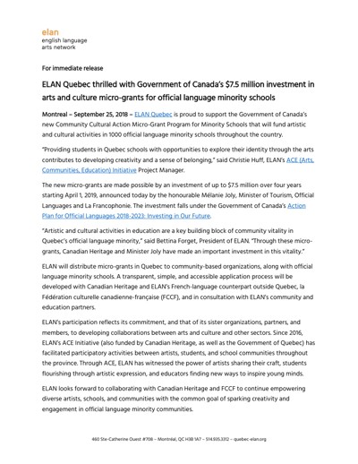 English Language Arts Network (ELAN). “ELAN Quebec Thrilled with Government of Canada’s $7.5 Million Investment in Arts and Culture Micro-Grants for Official Language Minority Schools,” September 25, 2018.