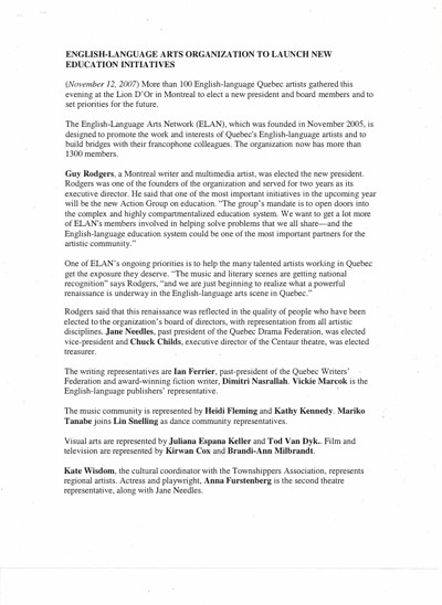 English Language Arts Network (ELAN). “English-Language Arts Organization to Launch New Education Initiatives,” November 12, 2007.