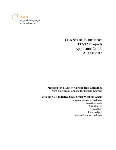 Armeni, Virginia, Christie Huff, Paula Knowles, and English Language Arts Network (ELAN). “ELAN’s ACE Initiative TEST! Projects Applicant Guide,” August 2016.