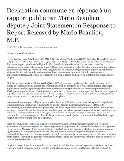 English Language Arts Network (ELAN), Quebec Writers’ Federation (QWF), Quebec Drama Federation (QDF), and Association of English-language Publishers of Quebec (AELAQ). “Déclaration commune en réponse à un rapport publié par Mario Beaulieu, député / Joint Statement in Response to Report Released by Mario Beaulieu, M.P.,” December 15, 2023.