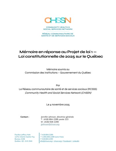 Community Health and Social Services Network (CHSSN). Brief in Response to Bill 1 - Québec Constitution Act, 2025, November 4, 2025.