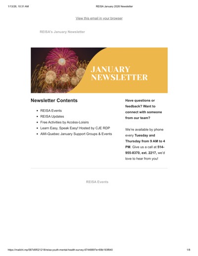 Réseau de l’est de l’île pour les services en anglais (REISA). “REISA’s January 2026 Newsletter” (January 2026).