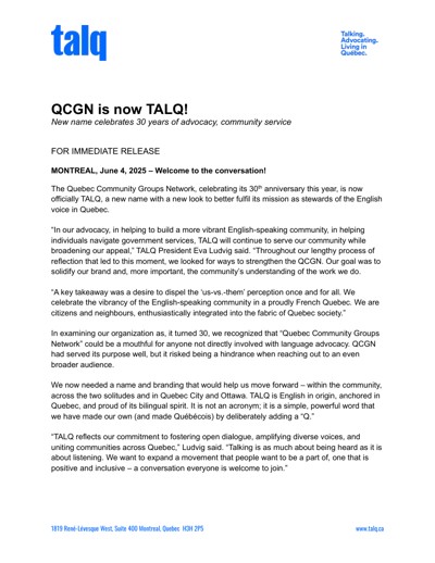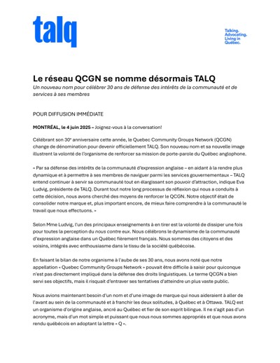 Quebec Community Groups Network (QCGN). “Le réseau QCGN se nomme désormais TALQ,” June 4, 2025.
