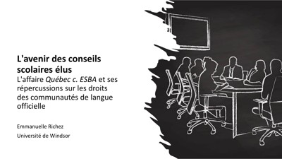 Richez, Emmanuelle. “L’avenir des conseils scolaires élus : l’affaire Québec c. ESBA et ses répercussions sur les droits des communautés de langue officielle” Presented at the 92e Congrès de l’Acfas, Montréal, QC, May 9, 2025.