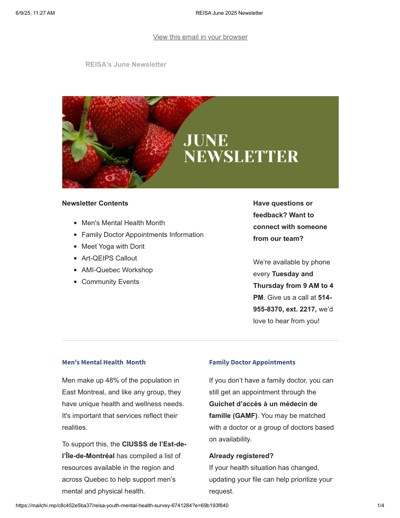 Réseau de l’est de l’île pour les services en anglais (REISA). “REISA’s June 2025 Newsletter” (June 2025).