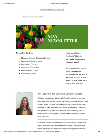 Réseau de l’est de l’île pour les services en anglais (REISA). “REISA’s May 2025 Newsletter” (May 2025).