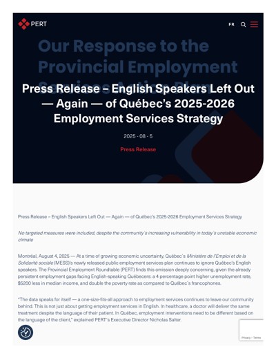 Provincial Employment Roundtable (PERT). “English Speakers Left Out — Again — of Québec’s 2025-2026 Employment Services Strategy,” August 5, 2025.