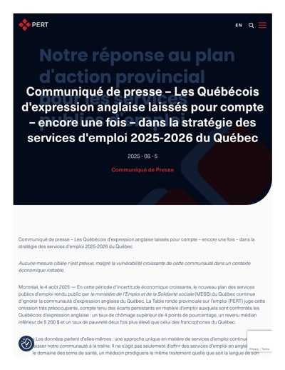 Provincial Employment Roundtable (PERT). “Les Québécois d’expression anglaise laissés pour compte – encore une fois – dans la stratégie des services d’emploi 2025-2026 du Québec,” August 5, 2025.